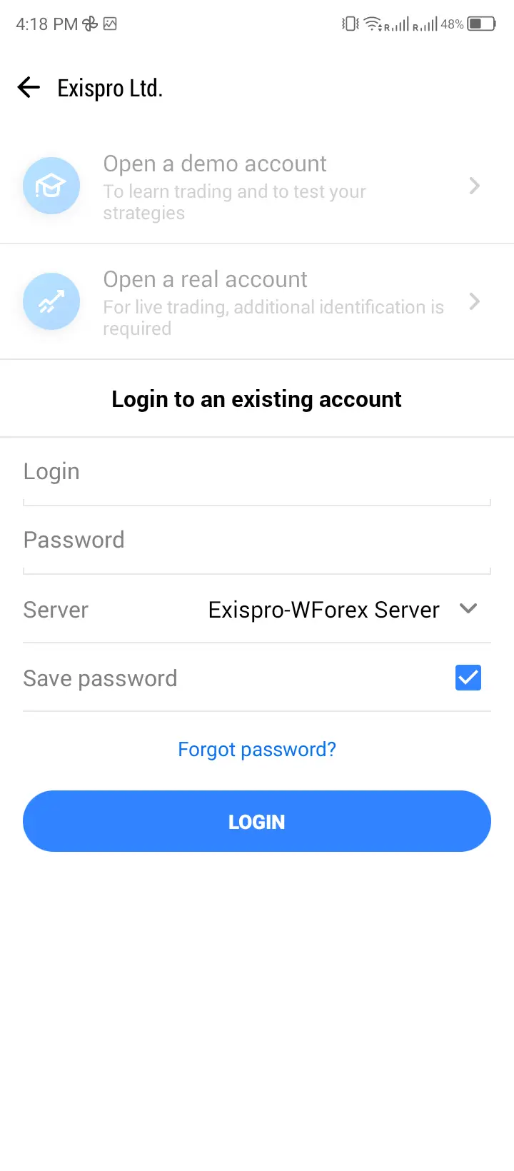 Specify the authorization data, where «Login» - a trading account number, «Password»- a trading password.